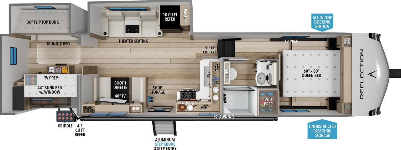 Reflecting a perfect union of luxury and value, the Reflection 100 Series takes the half-ton towable fifth-wheel RV experience to unprecedented levels. Engineered with meticulous attention to the towing capacities of today's half-ton trucks, these RVs ensure safe and effortless towing, allowing you to navigate with reassuring stability and power. Despite their competitive pricing, they astonish with the wealth of high-end features packed inside. Your on-road living experience is enriched by a kitchen fitted with premium appliances that seamlessly blend with the elegance of a residential-styled interior. The interiors are resplendently spacious, mirroring the comfort and style of a modern home, making your travels not merely journeys but a mobile extension of your home life. In the Reflection 100 Series, we've fused affordability with an unparalleled level of comfort to enhance your adventures on the road